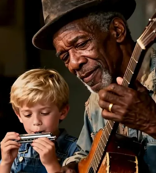 The grandfather, his hair silver and face weathered with age, moved with a slow but steady pace, holding a guitar in his hands. His fingers, worn from years of hard work, gently adjusted the strings, preparing for the moment. The young boy beside him, no older than 12, looked up at his grandfather with a mixture of admiration and nerves. His small hands wrapped around a microphone, his body slightly trembling with the weight of the performance ahead.